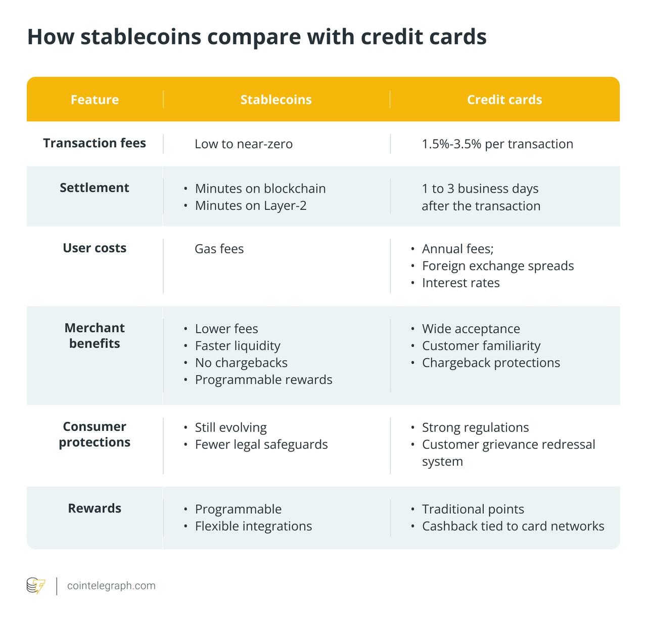 Стейблкоины представляют собой альтернативу кредитным картам, решая две самые большие проблемы платежей в США: высокие комиссии и медленные расчеты. Платежи по кредитным картам могут казаться мгновенными, но продавцы обычно ждут поступления средств от одного до трёх рабочих дней. В течение этой задержки они также платят комиссию в размере 1,5–3,5% за транзакцию, что снижает маржу и часто перекладывается на плечи потребителей. Стейблкоины обрабатываются в блокчейн-сетях, обычно в течение нескольких секунд или минут, что значительно дешевле, что предоставляет как продавцам, так и покупателям более быстрый и выгодный вариант. Неудивительно, что стейблкоины привлекли внимание продавцов, авиакомпаний и крупных ритейлеров, стремящихся снизить свою зависимость от устоявшихся сетей Visa и Mastercard. Внедрение стейблкоинов позволяет им компенсировать потерянную прибыль, сохранить низкую маржу и при этом поддерживать эффективные программы лояльности. Проекты теперь используют блокчейн-платформы для начисления бонусных баллов в стейблкоинах. Это помогает сохранять реальную ценность, обеспечивая привлекательность программ лояльности для клиентов и принося ощутимую финансовую выгоду компаниям. Клиенты могут по-настоящему владеть своими бонусными баллами, что означает, что они могут копить баллы или переводить их в другое место, чтобы потратить за пределами платформы, на которой они были заработаны. Вот таблица, иллюстрирующая сравнение стейблкоинов с кредитными картами: